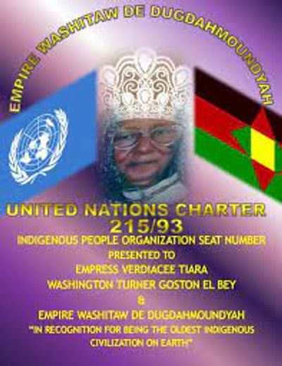 The previous Empress of the Washitaw authored several programs that were implemented on federal and state levels. She was an invited advisor to the U.S. congress, the presidents, and a delegate to the O.A.U. (Organization of African Unity) meeting. In July and August of 1996, the Empress led a group of emissaries to the summer conferences at the United Nations offices in Geneva, Switzerland. During the 14th session of the United Nations Working Group on Indigenous Populations.